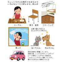 テーブル、家具、窓、フローリングなどの拭き掃除に。床の拭き掃除に使う一般的なワイパーにも合うので便利です。その他お庭やベランダで遊んだワンちゃんや猫ちゃんの身体・足ふきに。当店スタッフは自家用車に1袋常備しています。洗車したときに車内の拭き掃除をしたり、お出かけした時にちょっと手を拭きたいときも便利です。