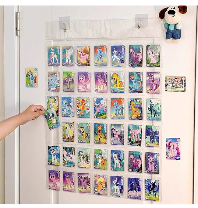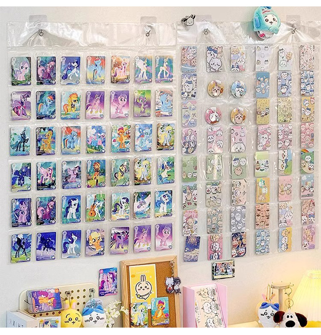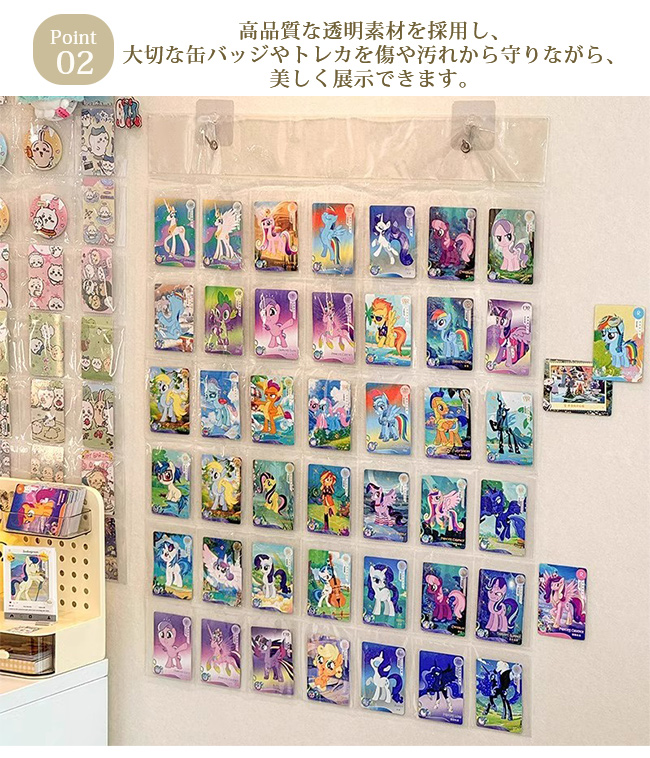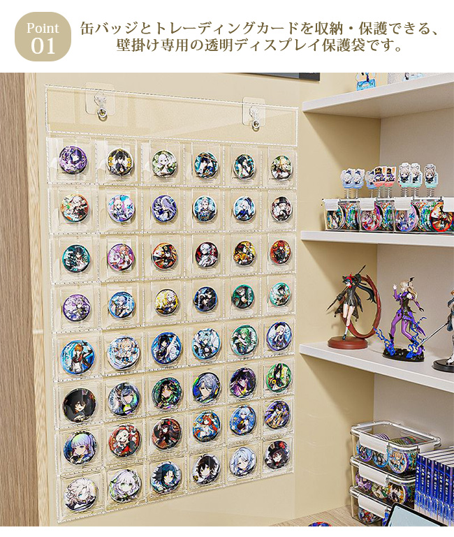 缶バッジとトレーディングカードを収納・保護できる、壁掛け専用の透明ディスプレイ保護袋です。