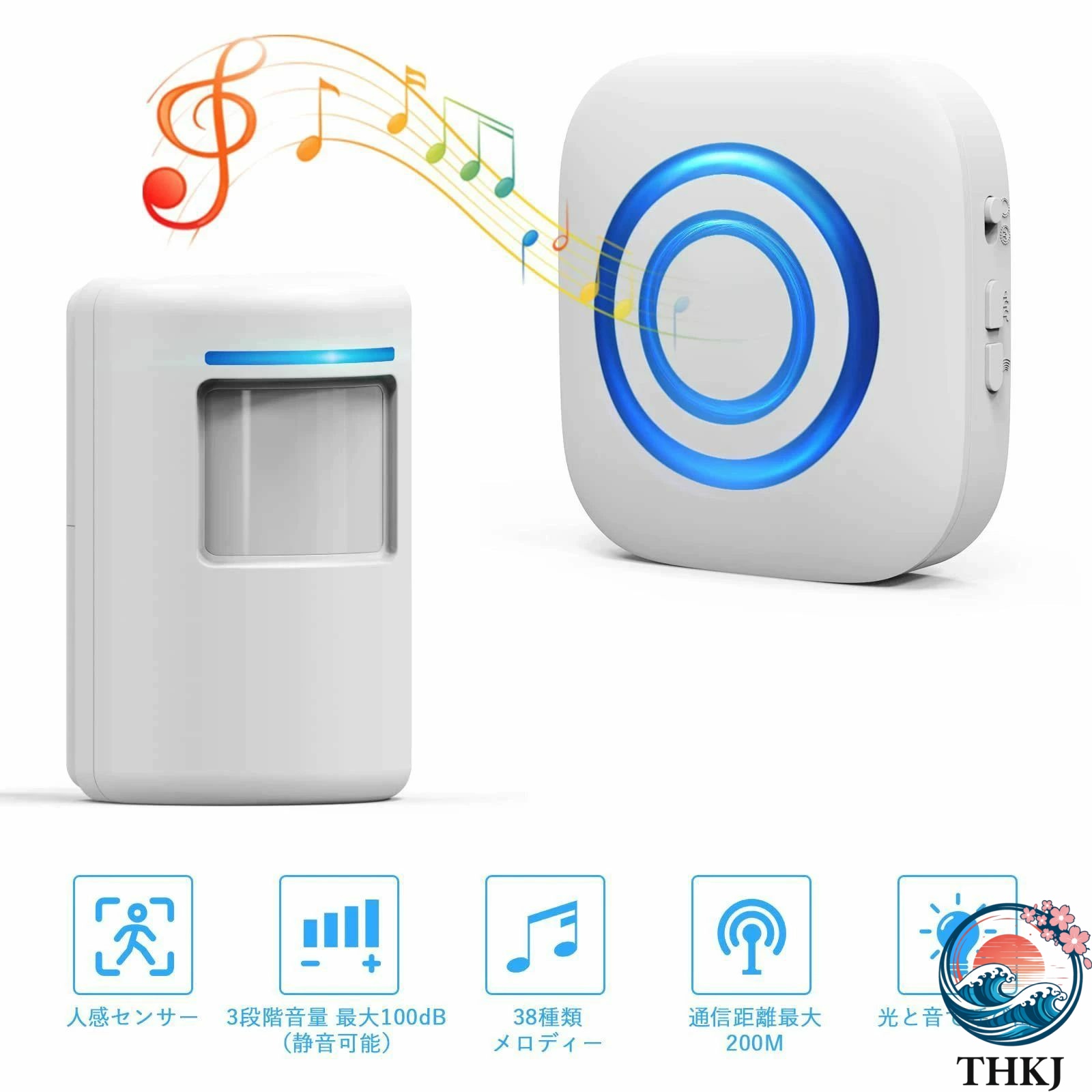 受信機/送信機セット人感センサー送信機:来客などを正確に感知できる動体検知機能、感知距離は3-7mで、感知角度は上下15°で左右100°です。 回転すればセンサーの感知方向が自由に調整できます。電池不要の受信チャイム(コンセントに差し込むだけ):離れた場所で青い光とチャイム音でお知らせ。受信機電波受信距離は屋外遮蔽物の無い状態で200m屋内で、見通しの良い場所で最大70m。