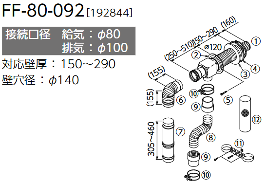 長府製作所 うす型給排気筒 FF-80-092 接続口径80Φ・100Φ FF式石油給湯器部材