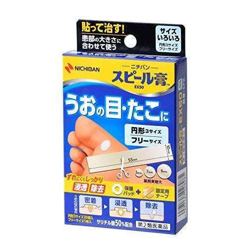・小児に使用させる場合には、保護者の指導監督のもとに使用させてください。・本品は外用にのみ使用し、内服しないでください。・薬剤部分が健康な皮ふに付着すると、その部分も白く軟化し、痛んだりしますので、患部の大きさより少し小さめの円形のものを選び、そのまま貼れば便利に治療できます。患部に合わない場合にはフリーサイズを適宜切ってお使いください。 裏面の〈スピール膏EX50の上手な使用例〉をご覧ください。・薬剤が患部からズレた場合は位置を戻すか、新しいものに交換してください。・固定用テープをお使いの際には、皮ふかぶれやテープのはがれをさけるため、テープを伸ばさずにお貼りください してはいけないこと (守らないと現在の症状か悪化したり、副作用が起こりやすくなる)次の部位には使用しないでください。1.目の周囲、粘膜、やわらかい皮ふ面(首の周り等)、顔面等(角質溶解作用の強い薬剤ですからこのような部位には使用しないこと)2.炎症又はキズ、化膿のある患部等(炎症やキズ、化膿のある患部等に使用すると刺激が強く、症状を悪化させることがあります)3.群生したいぼ、身体に多発したいぼ4.みずいぼ5.湿ったいぼ6.外陰部や肛門周囲にできたぶよぶよしたいぼ7.褐色か淡黒色の扁平に隆起した老人性いぼ8.かきキズにそって一列にできた若年性扁平いぼ 相談すること1.次の人は使用前に医師、薬剤師又は登録販売者に相談してください。2.乳幼児(乳幼児においては皮ふが弱く注意が必要です)3.本人又は家族がアレルギー体質の人4.今までに薬や化粧品等によるアレルギー症状(例えば発疹・発赤、かゆみ、かぶれ等)を起こしたことがある人(アレルギーを起こした薬や成分をさけて使用する必要があります)5.妊婦又は妊娠していると思われる人(サリチル酸の内服による動物実験で、胎児の奇形を起こす作用が報告されています)6.糖尿病の治療を受けている人(糖尿病患者は感染抵抗力が低下しています。角質を取る際に皮ふを傷つけてしまった場合、感染しやすくなります)7.本品が有効ないぼは、角質化された表面のざらざらした硬いいぼです。他のいぼについては専門医に相談してください。8.使用後、次の症状があらわれた場合は副作用の可能性があるので、直ちに使用を中止し、この添付文書を持って医師、薬剤師又は登録販売者に相談してください。関係部位:皮ふ症状:発疹・発赤、かゆみ9.長期間使用しても症状の改善が見られない場合は、使用を中止し、この添付文書を持って医師、薬剤師又は登録販売者に相談してください。[その他の注意]本品や固定用テープ等をはがす時は、皮ふを傷めないように体毛の流れに沿ってゆっくりはがしてください。●保管及び取扱いの注意(1)直射日光をさけ、なるべく湿気の少ない涼しい所に保管してください。(2)小児の手のとどかない所に保管してください。(3)誤用をさけ、品質を保持するため、他の容器に入れかえないでください。(4)開封後、残った薬剤(スピール膏TMEX50)及び固定用テープ類は、品質保持のため同じ袋には入れず、それぞれもとの袋に戻し、もとの箱に入れて保管してください。