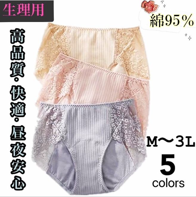 3枚セット レースサニタリーショーツ 生理用ショーツ 女性パンティ産褥ショーツ 純綿 通気性 漏れ防止 昼夜用下着