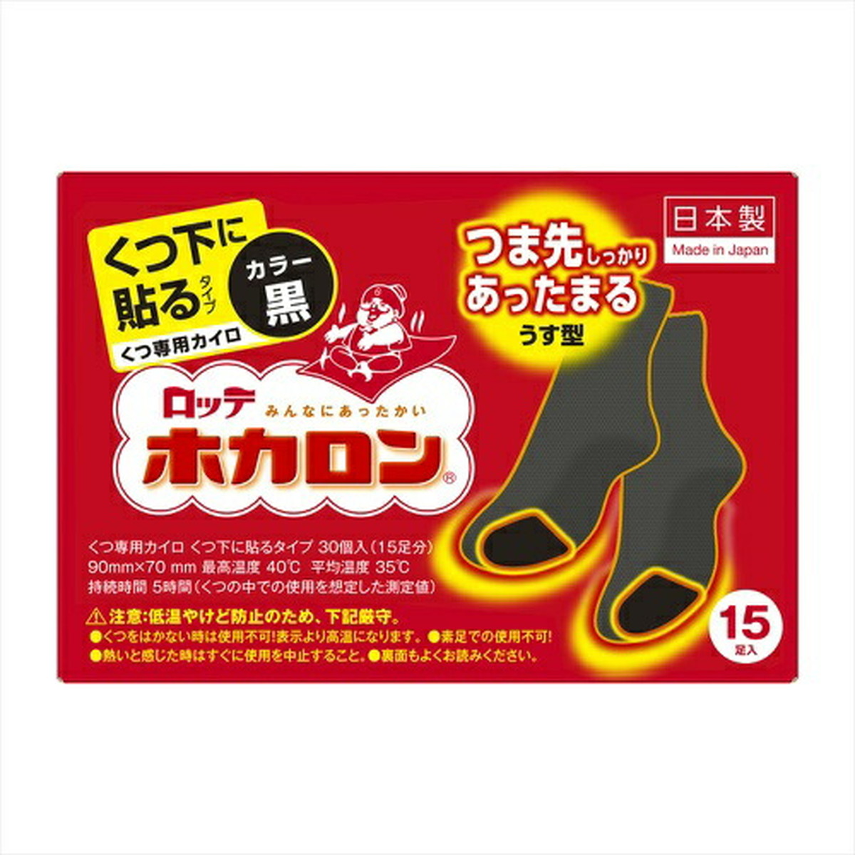冷えを感じやすいつま先をピンポイントであたためる靴下のつま先部分に貼る黒色タイプのホカロン原材料/成分/素材/材質鉄粉、水、活性炭、塩類、バーミキュライト、吸水性樹脂、木粉賞味期限/使用期限(製造から)3年原産国・製造国日本産使用方法/召し上がり方高温になりますのでやけどにご注意ください。外袋から内袋を取り出し、直接肌に当てずに、厚い衣類の上からや厚めの布等に包んでご使用ください。保存方法直射日光をさけ、涼しいところにおいてください。幼児の手の届くところに置かないで下さい。発売元/製造元/輸入元ロッテ