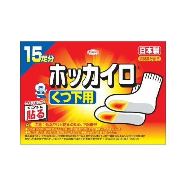 「ホッカイロ くつ下用 15足分(30個)」は、うすくてぴったり、くつ専用カイロ(くつ下に貼るタイプ)です。消臭成分配合。使用方法(1)使用直前に開封し、シールをはがしてもまずにくつ下の上から貼ってください。(2)すぐにくつをはいてください。●足にピッタリのくつ等で、空気の出入りが悪いと発熱しにくい場合があります。※足の裏専用です。足の甲側には貼らないでください。使用上の注意●低温やけどは、体温より高い温度の発熱体を長時間あてていると紅斑、水疱等の症状をおこすやけどのことです。なお、自覚症状をともなわないで低温やけどになる場合もありますのでご注意ください。●低温やけど防止のための注意・肌に直接貼らない。・就寝時は低温やけどしやすいので使用しない。・熱いと感じた時はすぐにはがす。また、熱いと感じた時にはがせない状態での使用は避ける。・急激に高温発熱し、ふくらむことがあるのでくつをぬいだ時やスリッパ、サンダル、長ぐつ、くつの中でゆとりのありすぎるサイズの大きいくつ等には使用しない。・ストッキング等薄手のものに使用する時は低温やけどに十分に注意する。・土踏まず、かかとには使用しない。・足の指を包むように使用しない。・温度が上がりすぎたり、袋が破れて中身がこぼれることがあるのでランニング等の運動時には使用しない。・片足に同時に複数個の使用は高温になる場合があるので使用しない。・他の暖房器具との併用は高温になるので避ける。・肌の弱い方や、幼児または身体のご不自由な方等、自分ですぐに取り出せないような方の使用は十分に注意する。・糖尿病等で血行障害のある方は、熱さを感じにくいことがあるので特に注意する。・肌に赤み、かゆみ、痛み等、やけどの症状がおきた時はすぐに使用を中止し、医師に相談する。●あたたかさを感じなくなったらすぐにはがす。●本品は食べられない。保存方法●直射日光をさけ、涼しい所に保存する。●幼児の手の届く所に置かない。