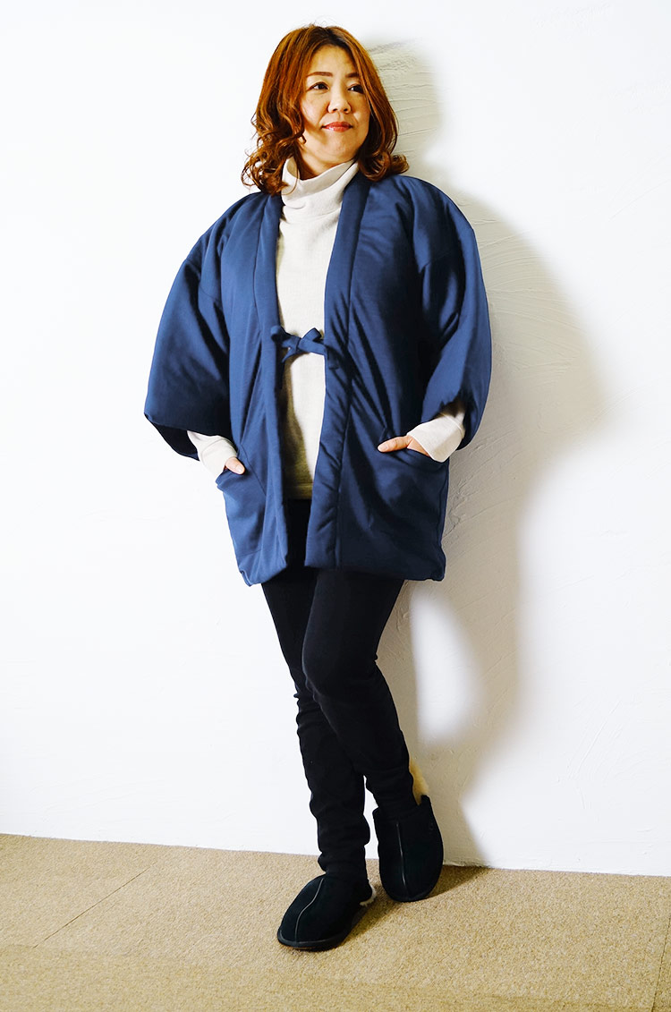 【ひめか】 はんてん レディース スラブニッ ト 綿入り 半纏 ハンテン 半天 どてら 丹前 即暖 ストレッチ 部 屋着 ルームウエア 半纏 紺 M