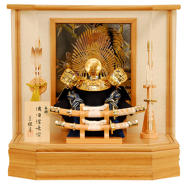 白木六角角切ケースに織田信長公の兜ケース飾りです。 |