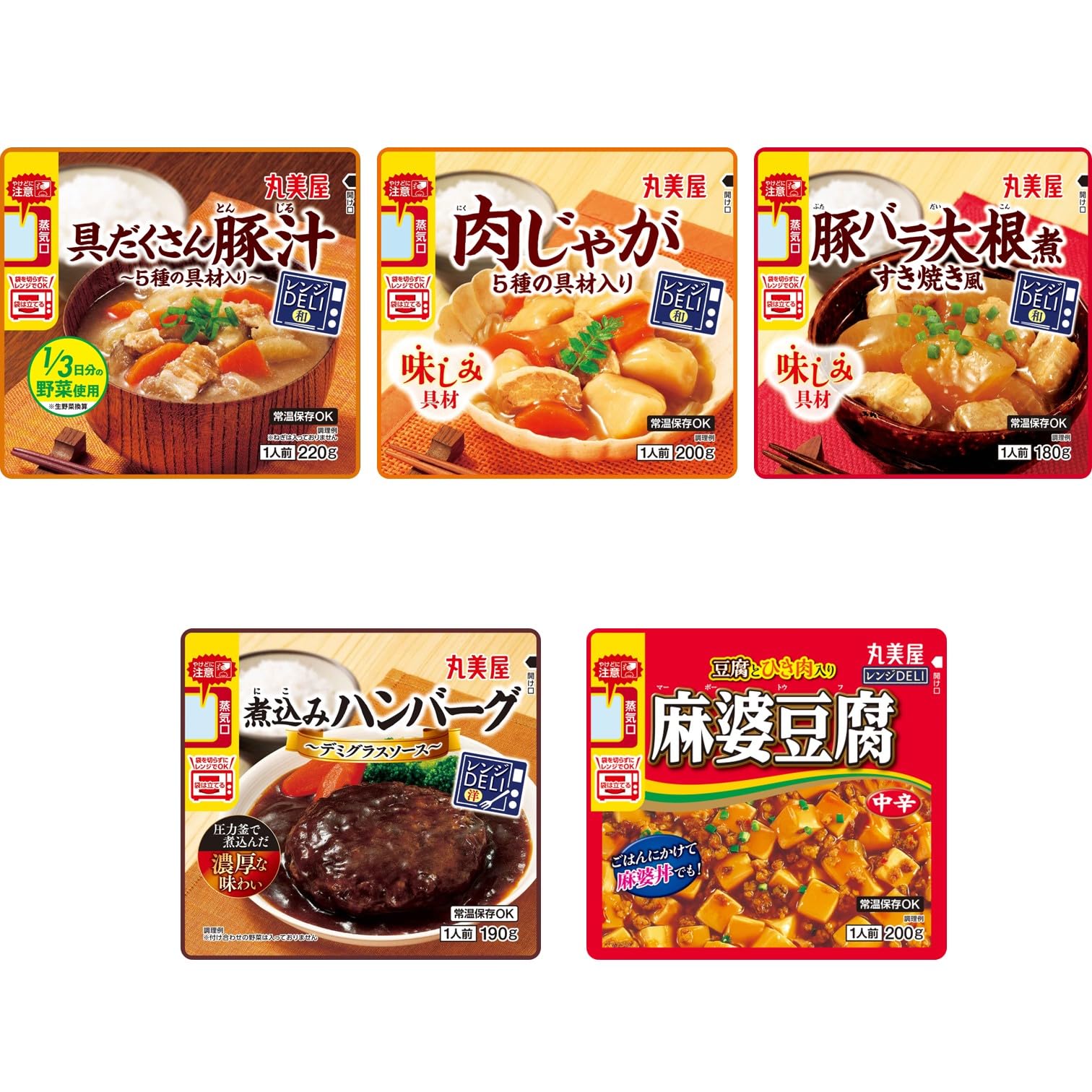 丸美屋 レンジDELI アソート詰合 5種×各1個(レンジ対応袋入・豚汁、肉じゃが、豚バラ大根煮、煮込みハンバーグ、麻婆豆腐中辛) 990g