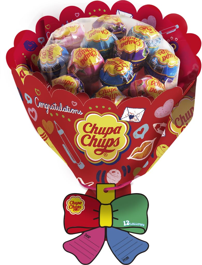 ・にピッタリなチュッパチャプスフラワーブーケ。チュッパチャプス ザ・ベスト・オブ・フレーバーで人気のコーラ、ラムネ、ストロベリークリーム、グレープの4種がアソート。貰うと思わず笑顔になる可愛いデザインでラッピング。