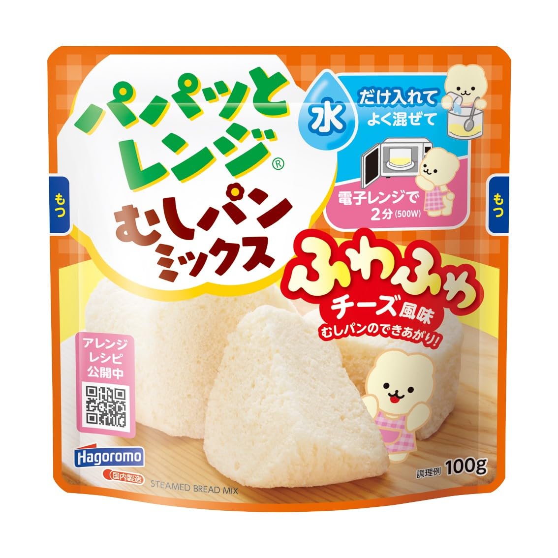 商品紹介 お水を50ml加えてよく混ぜ、電子レンジで2分(500W)加熱するだけで簡単に作れるむしむしパンミックスふわふわチーズ風味です。フルーツ缶などを使ったアレンジレシピもインターネット上で公開しています。パッケージ左下の二次元コードを読み込んで専用ページをチェックして、様々なアレンジむしパンをお楽しみください。 原材料・成分 小麦粉(国内製造)、砂糖、食用粉末油脂(植物油脂、コーンシロップ)、全卵粉末、小麦でん粉、プロセスチーズ / 膨張剤、乳化剤、増粘剤(キサンタンガム、アルギン酸エステル)、香料、(一部に小麦・卵・乳成分・大豆を含む)