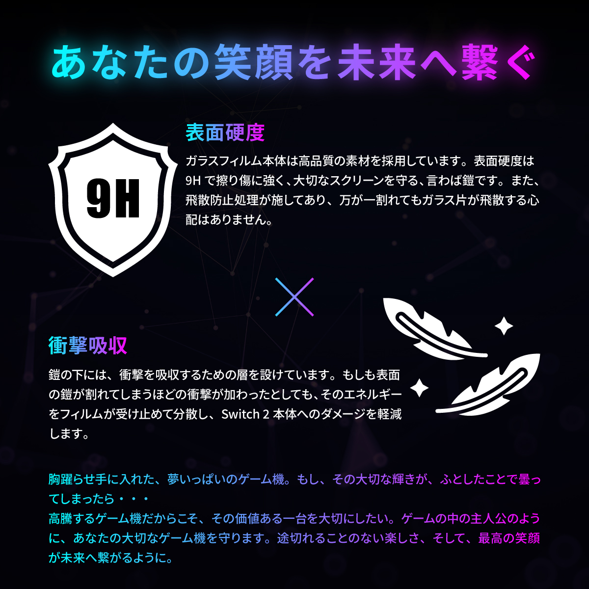 衝撃を吸収するための層を設けており、衝撃をフィルムが分散し、Switch 2本体へのダメージを防ぎます。