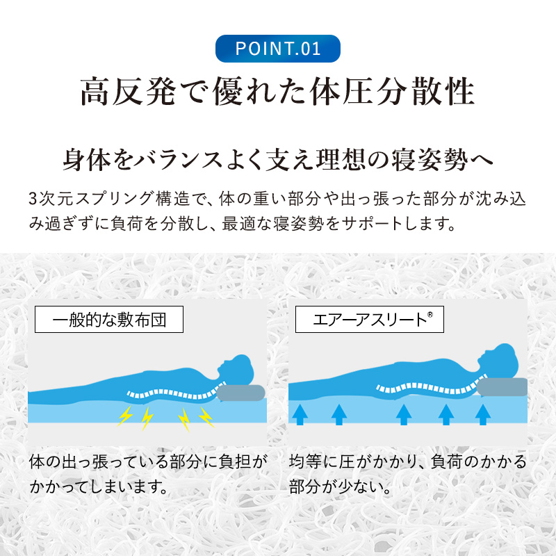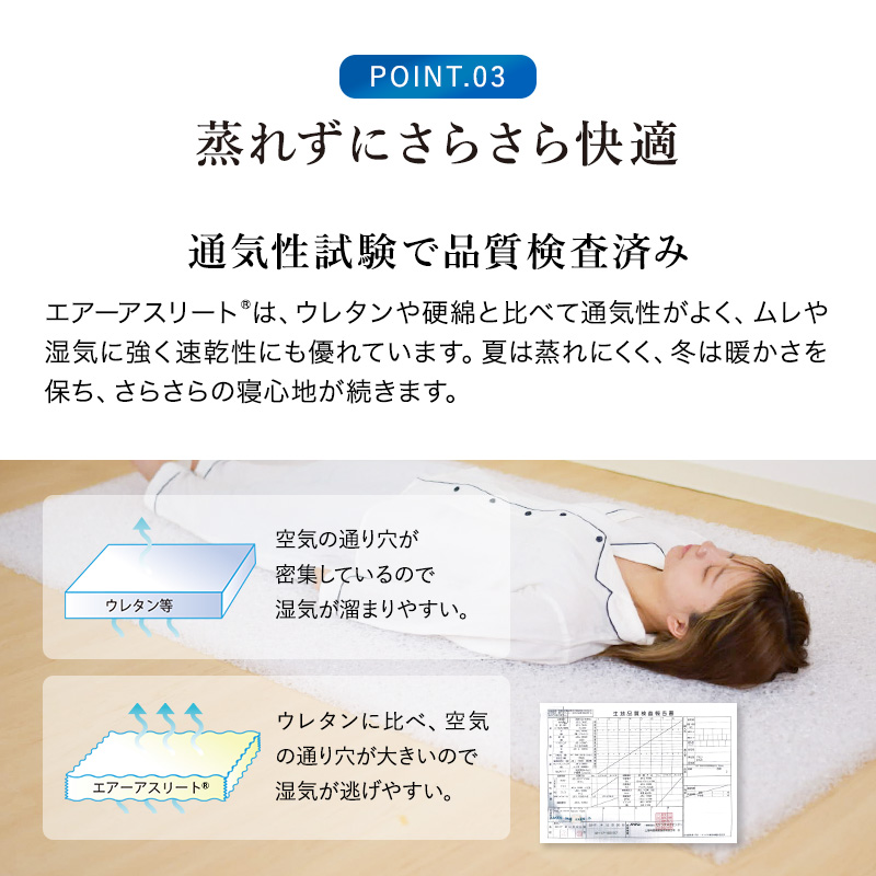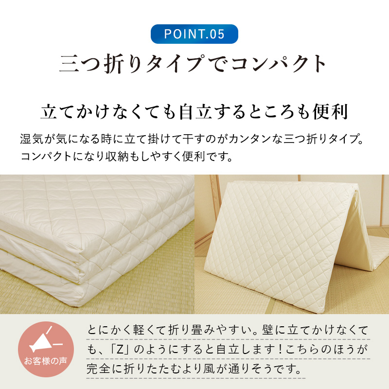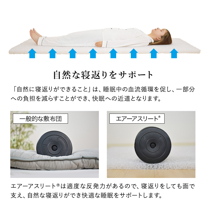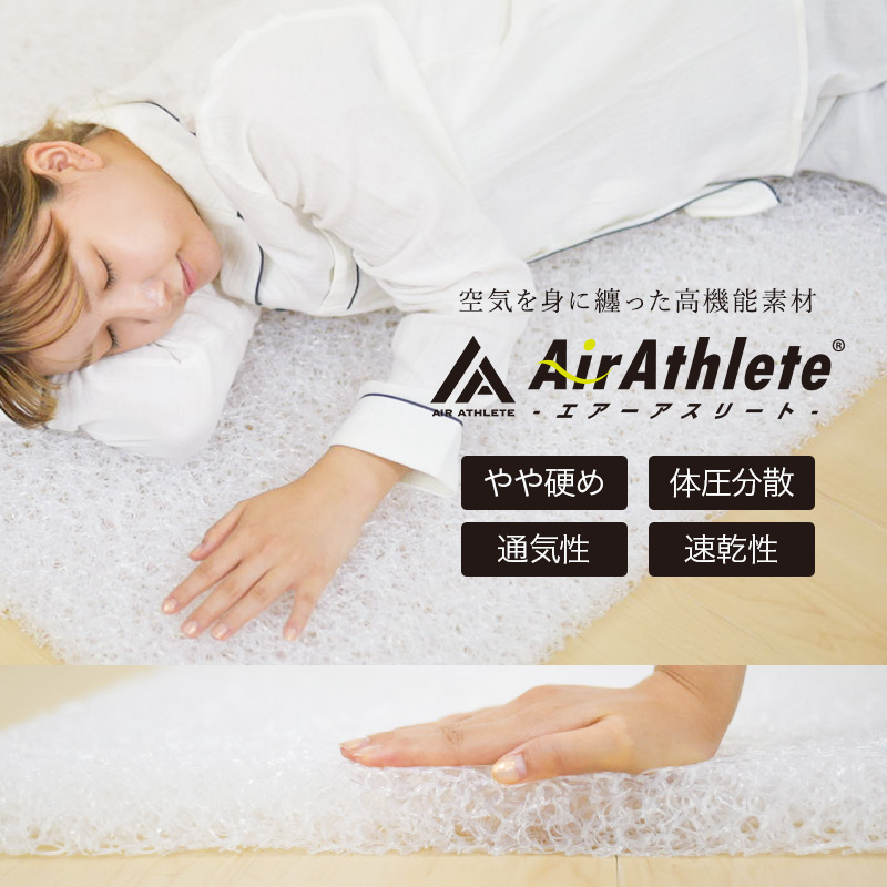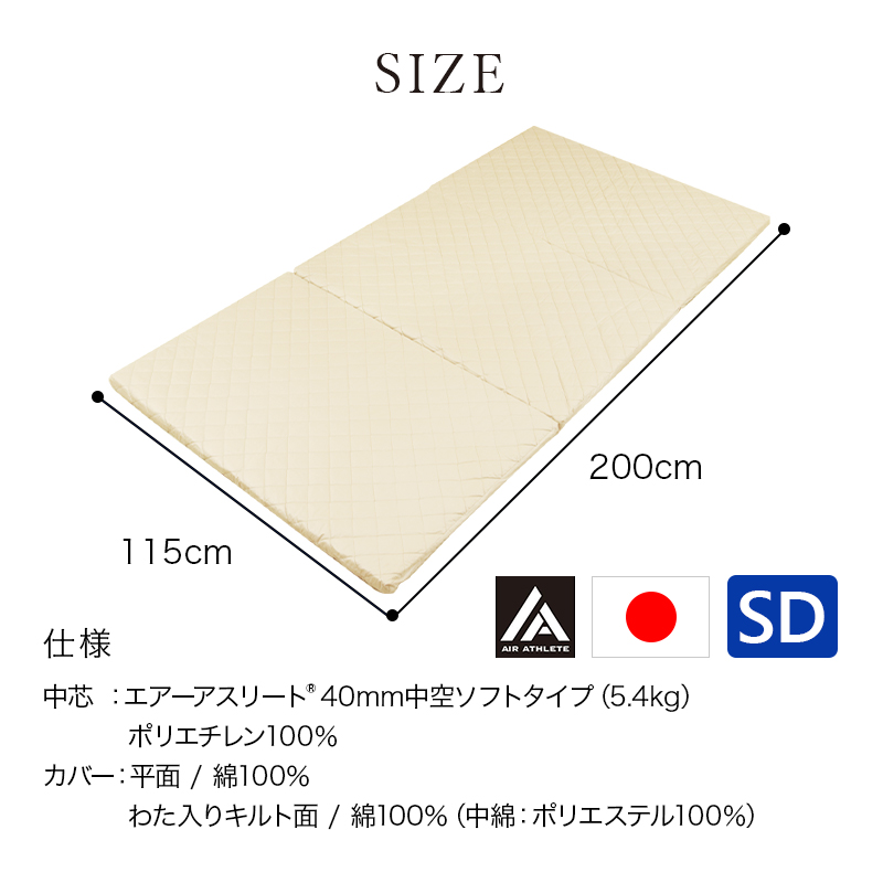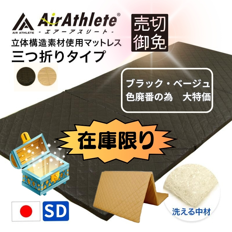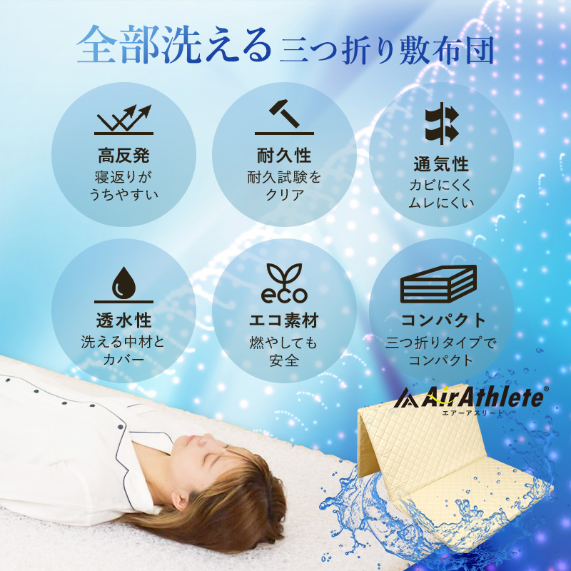 マットレス エアーアスリート 三つ折りタイプ セミダブル 綿100% 日本製 体圧分散性 高反発 通気性 透水性 耐久性 年中使える 洗える 水洗い 防臭