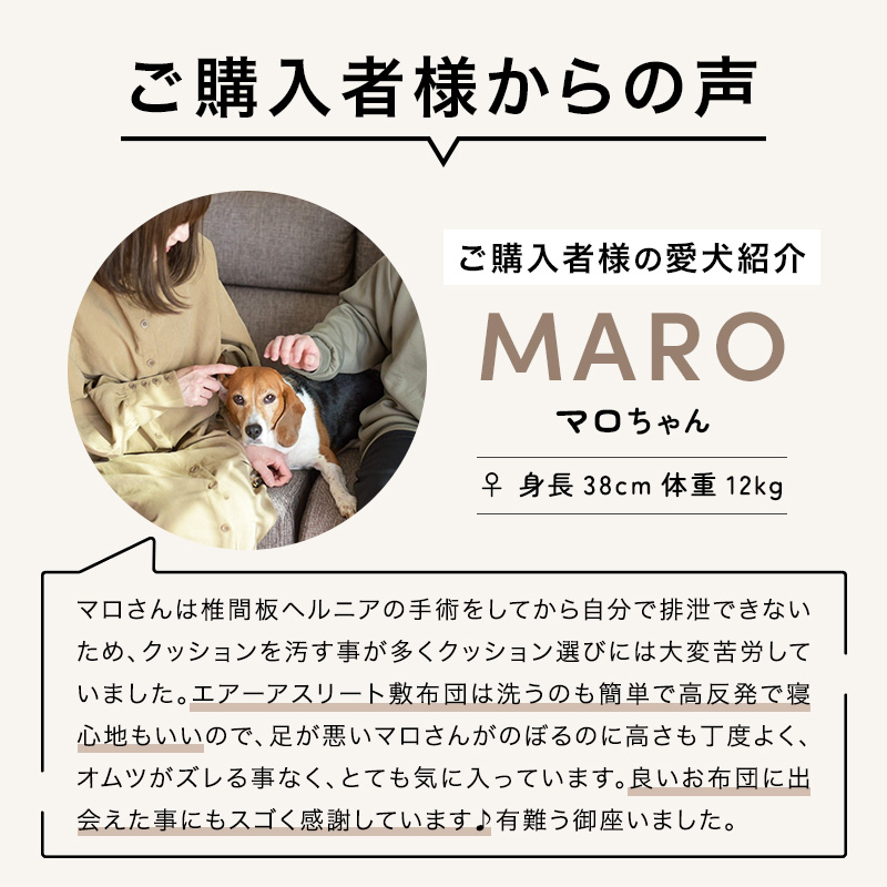 老犬が病気やケガによって自力で寝返りをうてない場合、このエアーアスリートの敷き布団を敷いてあげることによって、体圧による血流悪化を和らげ床ずれが起こりにくくなります。さらに可能であれば3時間程度の間隔で体の向きを変えて寝返りをうたせてあげるのがいいでしょう。