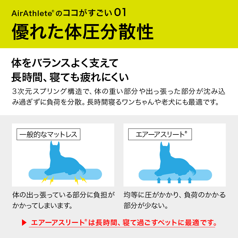 3次元スプリング構造で少し硬めですが、体をバランスよく支えて長時間寝ても疲れにくいので、老犬や老猫、長時間寝て過ごすペットに最適です。