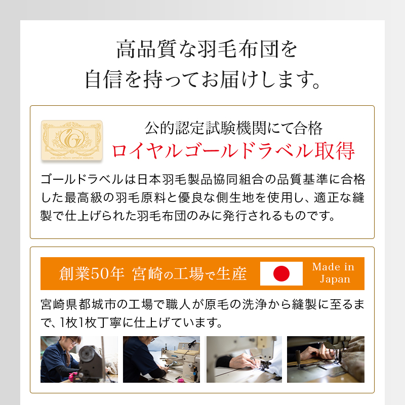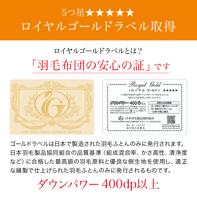 この商品は、日本羽毛製品協同組合より高級の「 ロイヤルゴールドラベル 」の認定を得た、安心安全の羽毛布団です。