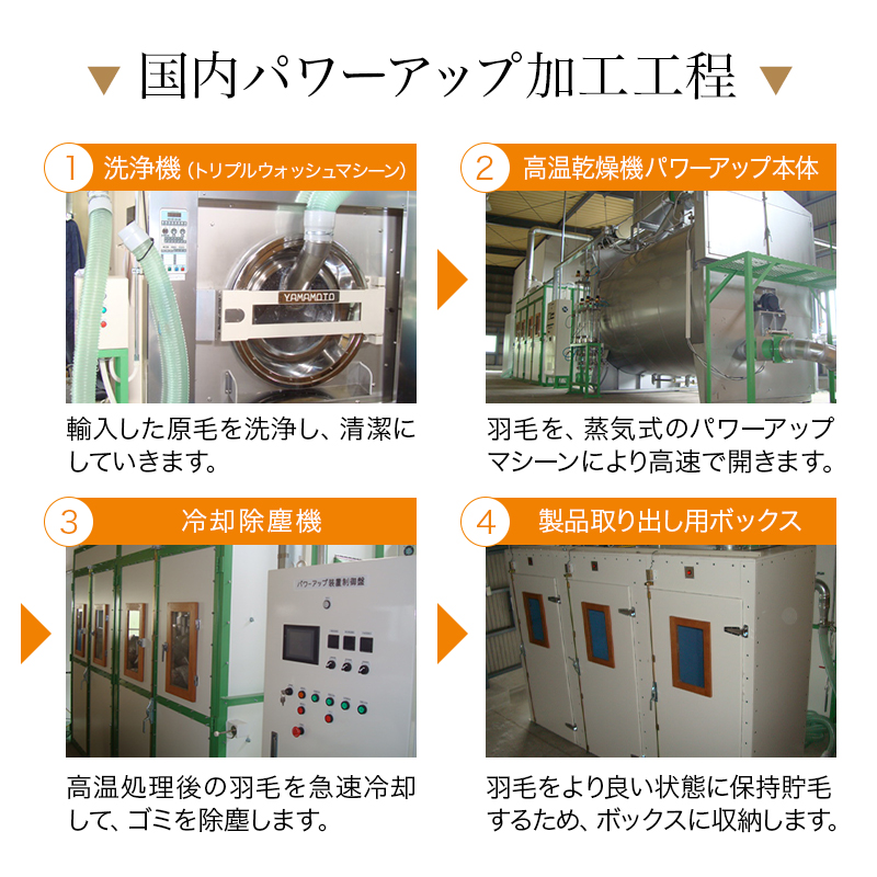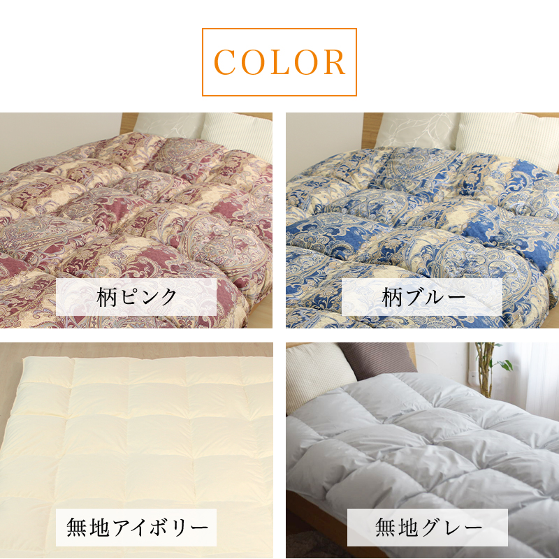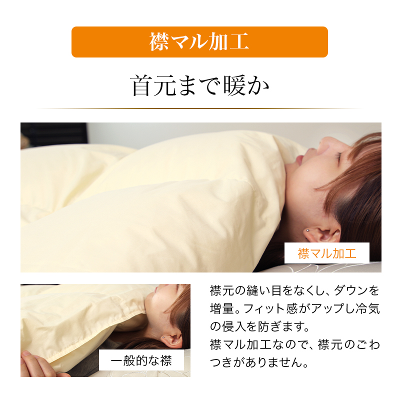 「使っているうちに襟元の羽毛が少なくなってきた」というお客様の声から生まれた 移動防止キルト を開発し、ひとつのマス目を箱状に区切ることで、羽毛の偏りを防げる構造になっております。