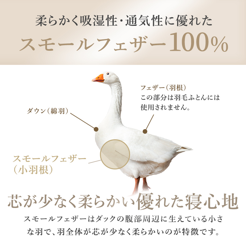 スモールフェザーはダックの腹部周辺に生えている小さな羽根で、羽全体が芯が少なく柔らかいのが特徴です。
