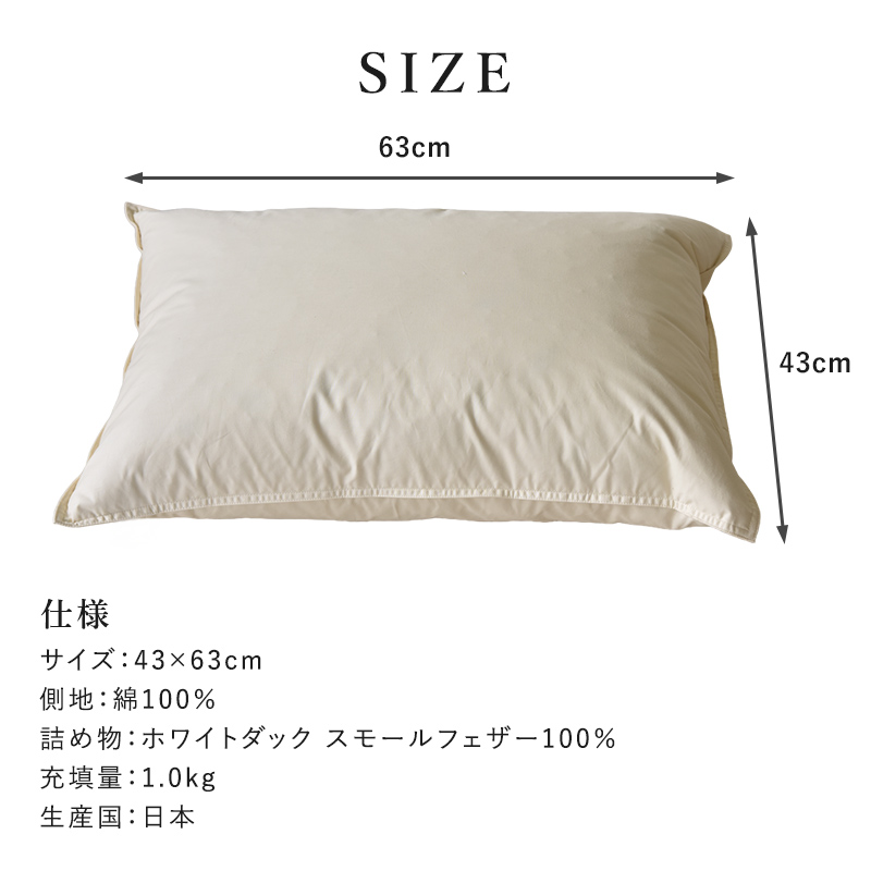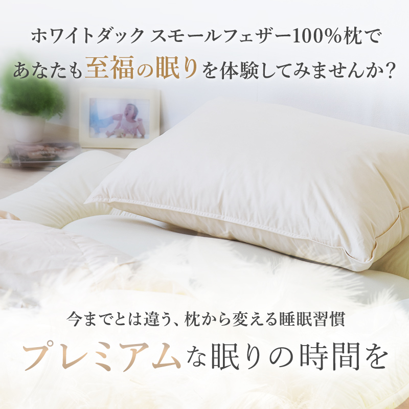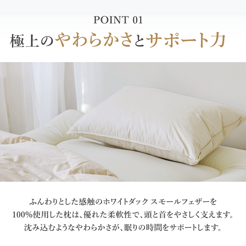 ふんわりとした感触のホワイトダック スモールフェザーを100%使用した枕は、優れた柔軟性で、頭と首をやさしく支えます。