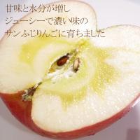 ふじの栽培の時に袋をかけないで栽培したいわゆる「無袋」栽培ふじのこと。「サン」は太陽をいっぱいあびたという意味で「SUN(太陽)」から名づけられました。しかしながら太陽が当たる面は限られており、また徐々に赤くならせるために色味はかなり落ちます。むらもできます。しかもさらに葉とらずだと葉っぱの影ができるので余計にきれいな赤色とは言えないものになります。けれども、「見た目より味」を選んだ岩渕さん、自慢の葉とらずサンふじをぜひお楽しみください。