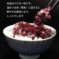 カシスふりかけはパウダー状です。温かいお米(蒸気)と混ぜると鮮やかな紫色になり、粉っぽさが減ります。むせないようにお召し上がりください。その他、カシスふりかけはおにぎりや、納豆に混ぜたりなどお好みでご活用ください。