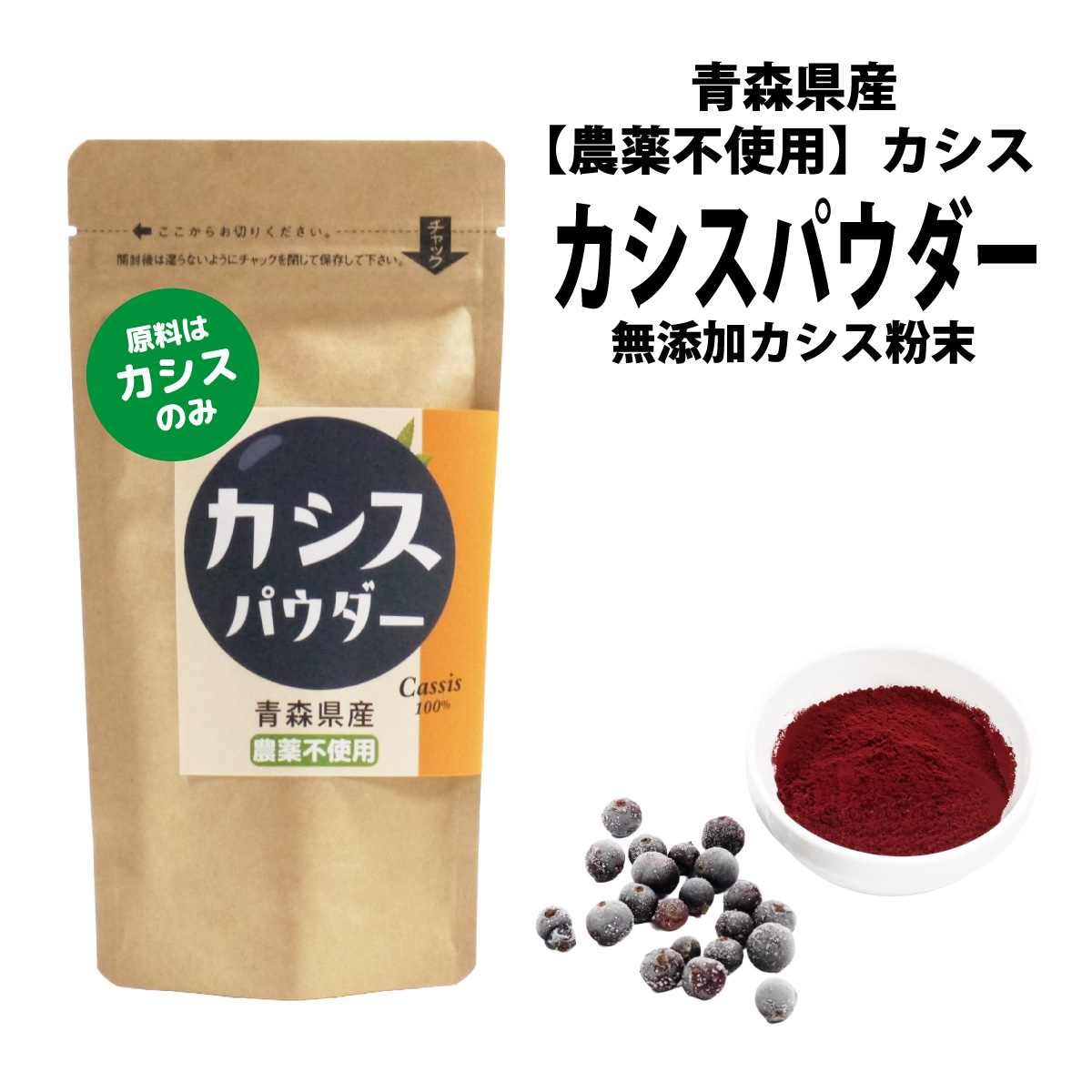 青森県産農薬不使用カシスを丸ごと使用したカシスパウダーです。袋をあけた途端、カシスの香りが漂います。カシス本来の酸味と風味をそのまま凝縮しています。今、話題の皮膚ガス対策などにもどうぞ。