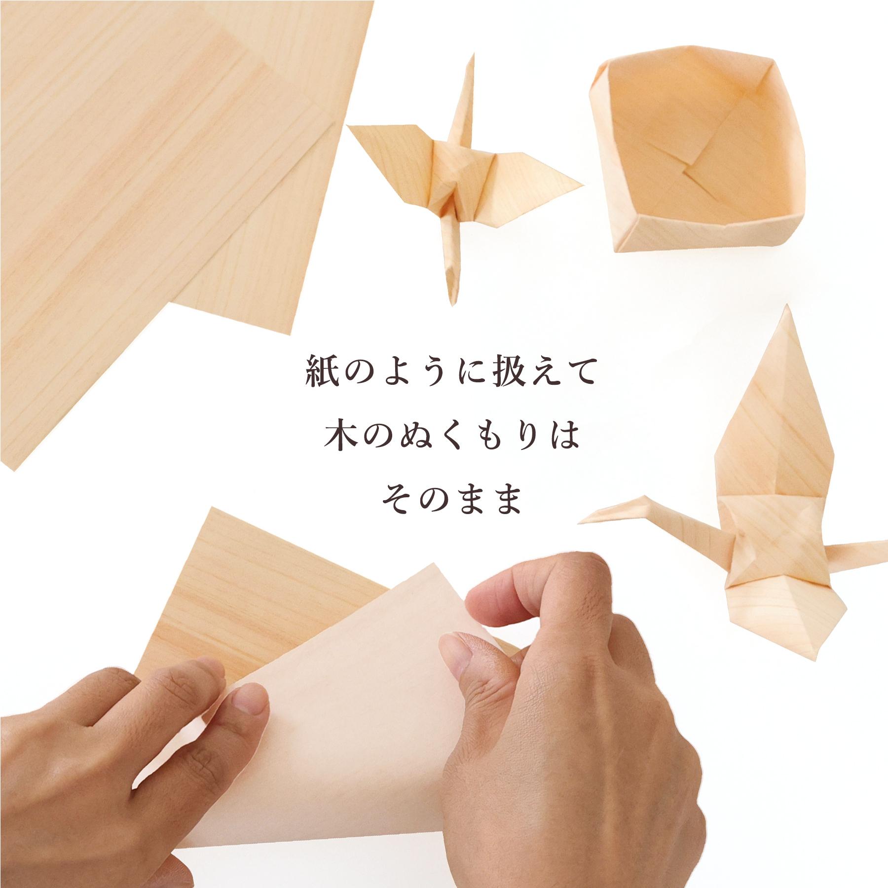 やさしさとぬくもりをそのままに、折ることができる新しい素材の折り紙です。精密な加工技術により、天然木をわずか0.15mmの薄さに仕上げました。ハサミやカッターで自由に加工でき、クラフトやハンドメイド作品にも活躍します。