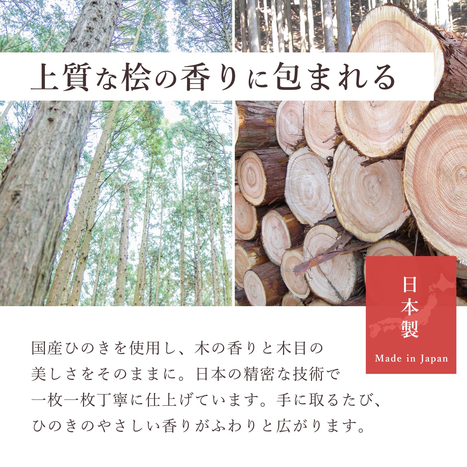 ひのき特有のやさしい香りと、1枚ごとに異なる木目の表情が魅力です。