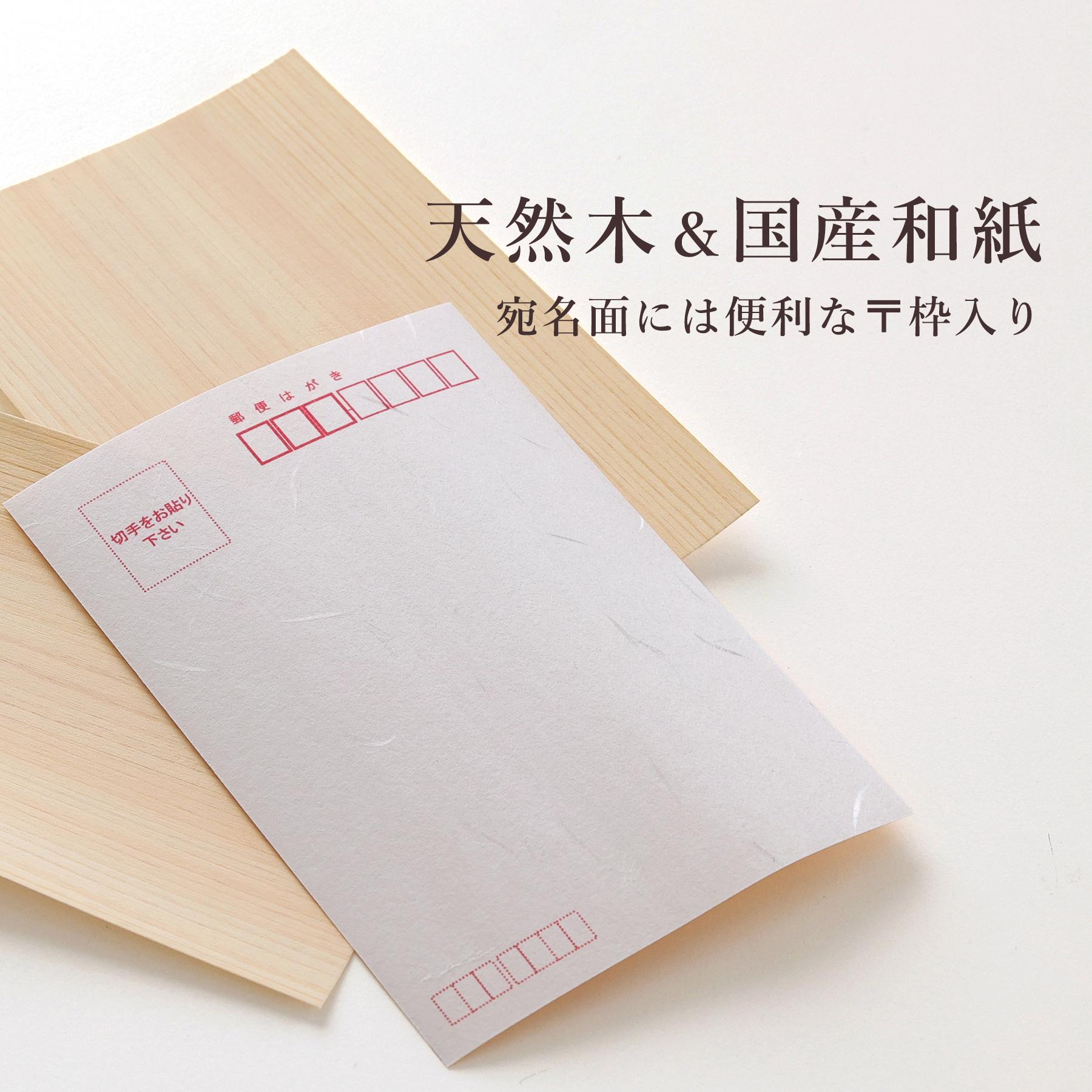 裏面は国産和紙を使用した郵便番号枠入りで、切手を貼るだけで投函できる本格はがき。木目が美しく、贈り物に添える一枚としても印象に残ります。