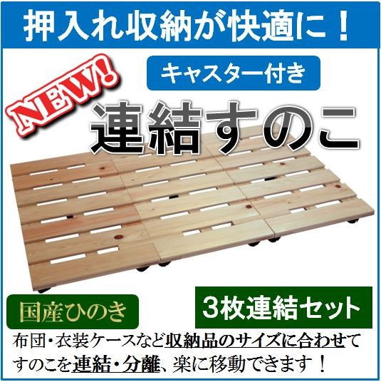 押入れ収納 連結すのこ(キャスター付き) 3枚連結セット 国産ひのき 布団 衣装ケース収納