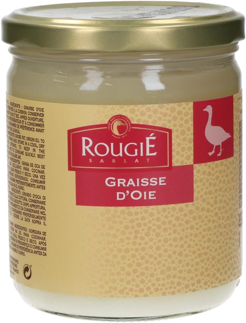 フランスで最も著名なフォアグラメーカーであるルージェ社は、フォアグラの他にもオイルの生産も行っています。グースファットはガチョウの脂と塩のみで造られた調味料で、フライパンにグースファットを入れてジャガイモを炒めると絶品の美味しさです。色素やアロマ、保存料などは一切使用していません。