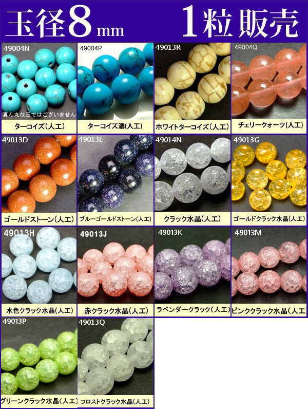 人工石:ターコイズ、ホワイトターコイズ、チェリークォーツ、ゴールドストーン(茶金石)、ブルーゴールドストーン(紫金石)、クラック水晶、ゴールドクラック水晶、レッドクラック水晶、ピンククラック水晶、ラベンダークラック水晶、マゼンタピンククラック水晶、グリーンクラック水晶、フロストクラック水晶(爆裂水晶)
