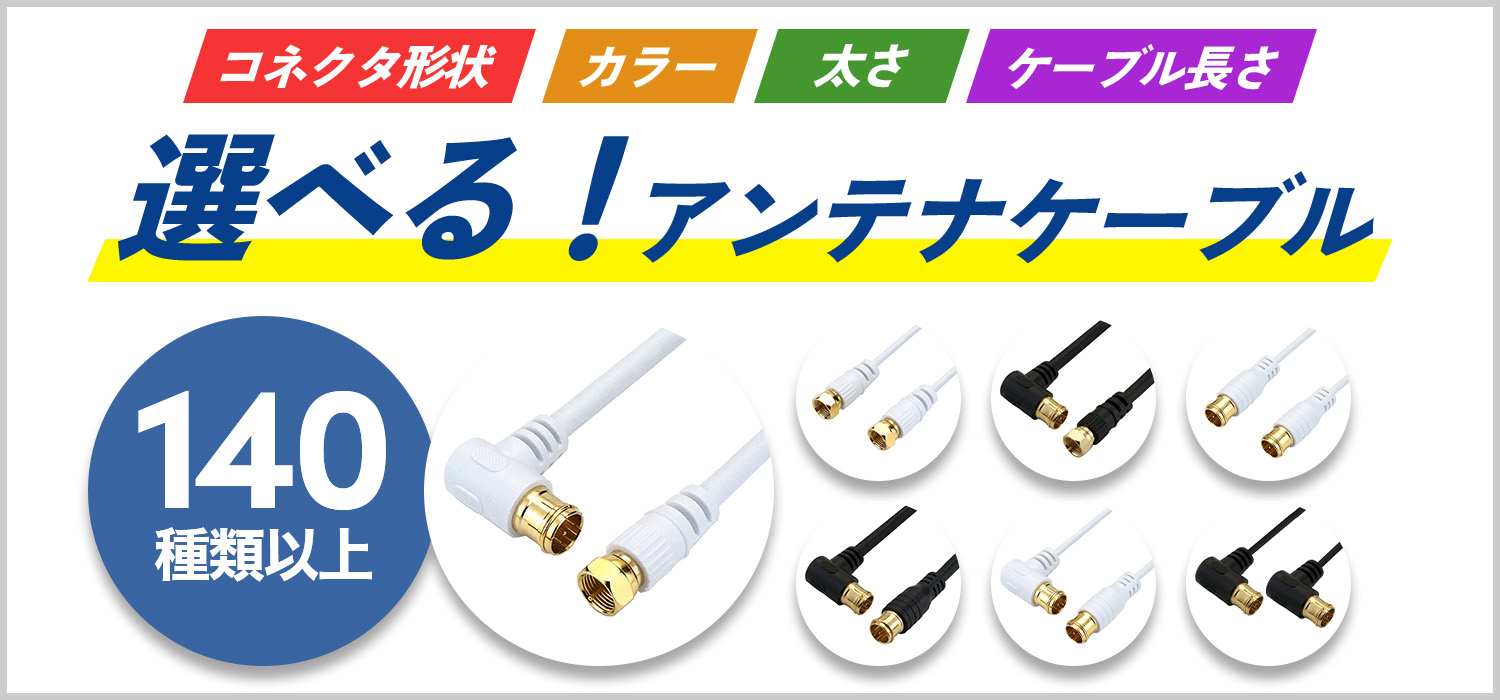 ■豊富なバリエーションバリエーション豊富なホーリックのアンテナケーブルはお好みの色や、レイアウトに合った長さ、コネクタの形状からお選びいただけます。