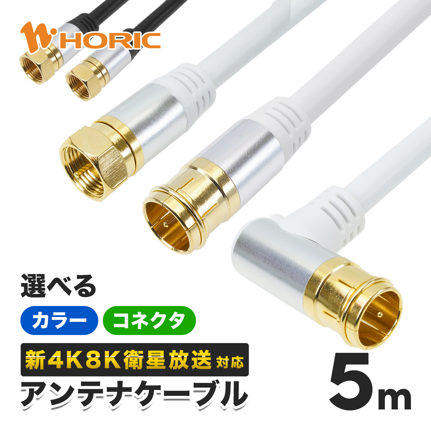 選べるアンテナケーブル 5m アルミヘッド 4K8K 地デジ BS CS TV 衛星放送 対応 テレビケーブル 同軸ケーブル ホワイト 白/ブラック 黒 4C HORIC ホーリック