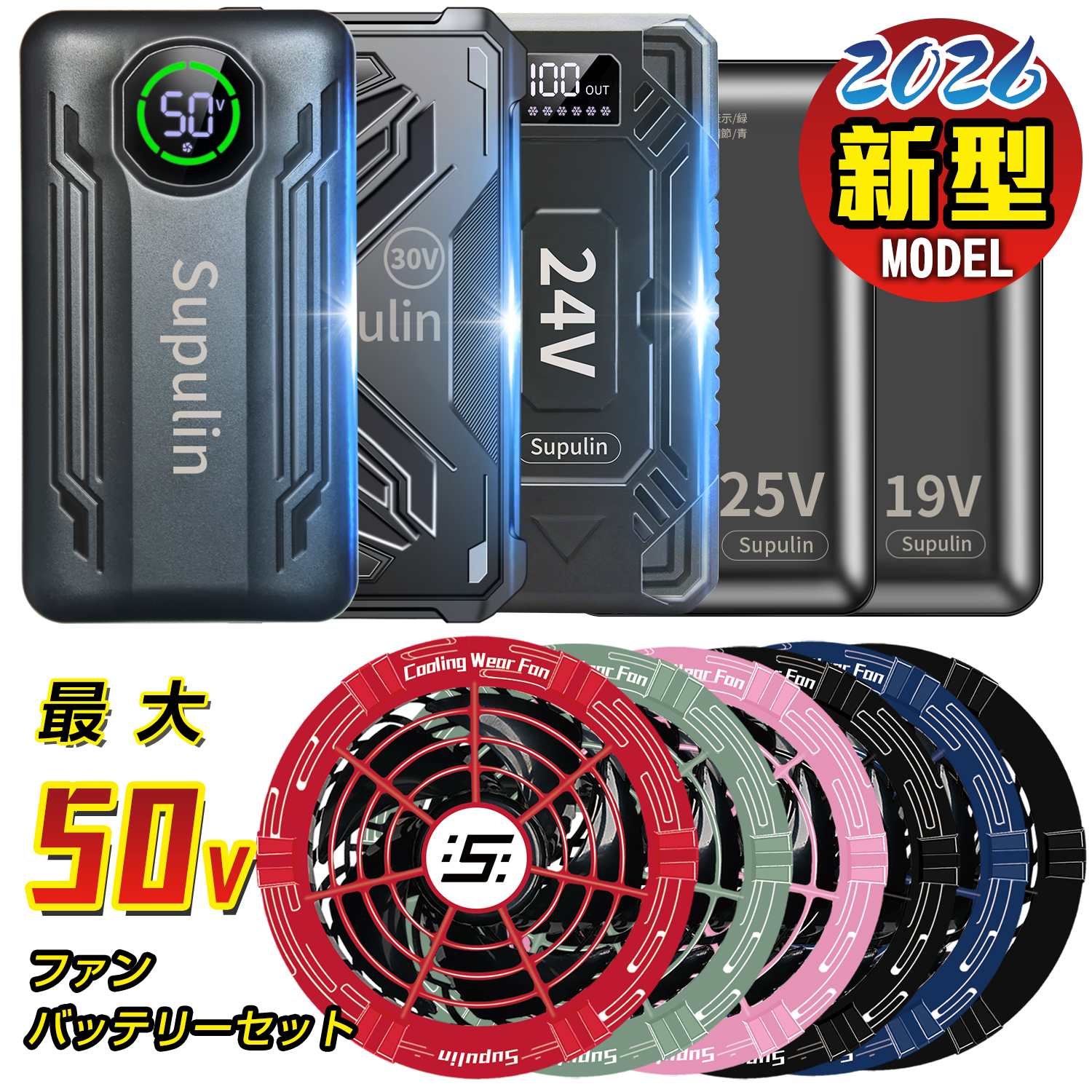 | ご注意 | 19Vバッテリーは19Vファンしか対応できません。 24Vバッテリーは24Vファンしか対応できません。 25Vバッテリーは25Vファンしか対応できません。 30Vバッテリーは30Vファンしか対応できません。 40Vバッテリーは40Vファンしか対応できません。 45Vバッテリーは45Vファンしか対応できません。 50Vバッテリーは50Vファンしか対応できません。 必ずセットでご利用ください。 ※ファンとバッテリーのみのセットです、作業服は付いておりません。ご注意ください。 ※バッテリーとファンは Supulin空調服 シリーズ 専用です。 ※本製品は「株式会社 空調服」 の 「空調服 ベスト 製品」とは互換性がございません。ご注意ください。 ※バッテリー定格電圧についてはバッテリーのラベル上に記載しております。 |
