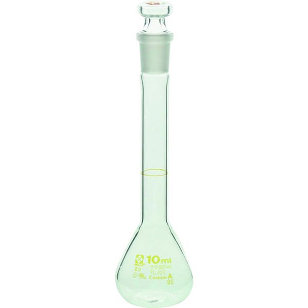・一定の体積を測るために用いられます。全量フラスコとも呼ばれます。・底の平らなフラスコに細長い首が伸びた形状で、首の部分に通常は1本の回線があります。・目盛のある首部分の径が細いため、同容量のメスシリンダーより目盛の精度が高いです。・一定の試薬濃度を正確に調整する時に使用されます。・目盛は受入体積(入っている体積)を表し、受用(入用)を意味するTCが表示しています。(TC:To Contain の略)・目盛は20℃の水を測定したときの体積を表します。・JIS規格(R3505)クラスAの「体積の許容誤差」に準拠しています。