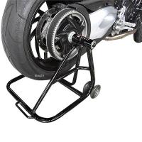 ローラースタンドのアップ時とダウン時は、車両の前後の移動を防ぐため輪ゴムの束等