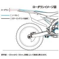 オフロードでの走行性能を損なわず足つき性を向上。車種専用で純正のリンクロッドと交換するだけのボルトオン設計。材質に7000系アルミ合金を使用し、高精度切削加工を施す。純正スタンド使用可。