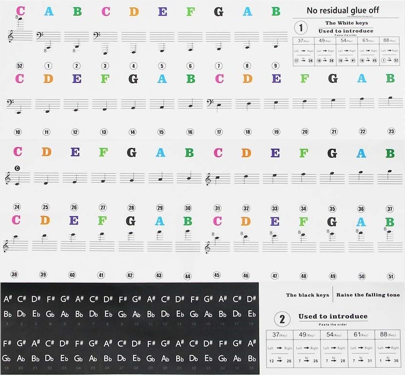 楽譜のアルファベット、五線譜等が印刷された鍵盤用シールです。