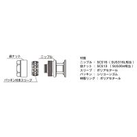 素材詳細:ニップル:SCS16 (SUS316L相当) 袋ナット:SCS13 (SUS304相当) スリーブ:ポリアセタール パッキン:シリコーンゴム 樹脂リング:ポリアセタール(識別タイプのみ)