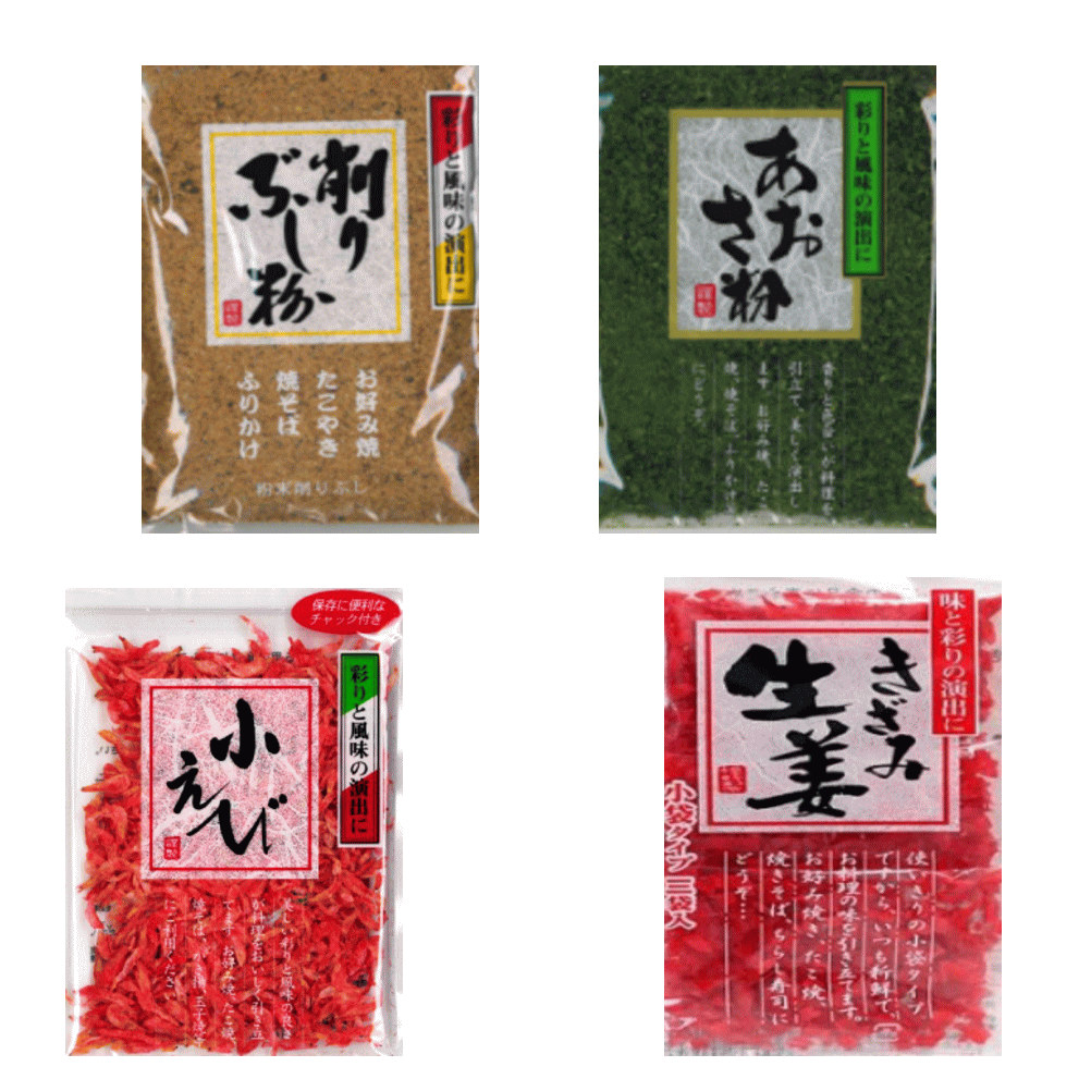 ご家庭でも、弊社冷凍の粉もんセットにも、麺類セットにも最適です。お好みでトッピングするだけで、味、風味、彩りが格段に変わります。