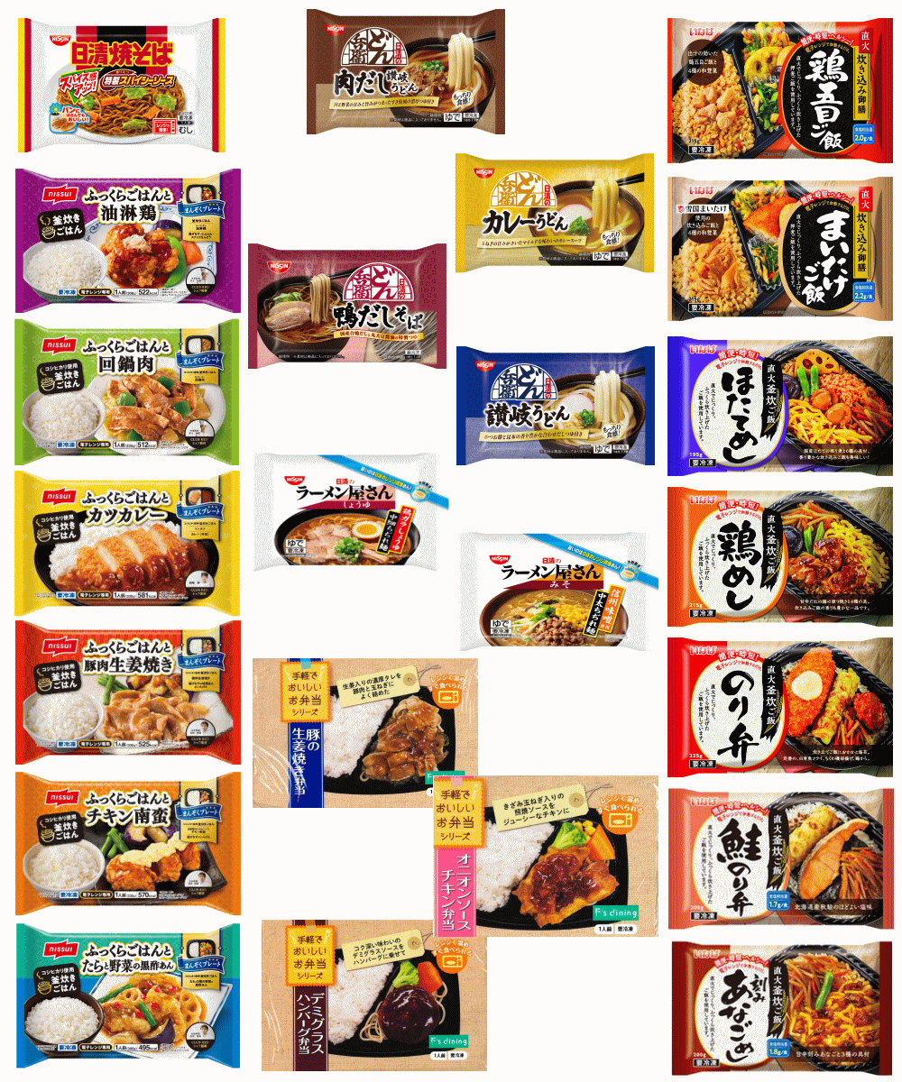 ●白ご飯が旨い、いなば食品・藤本食品・ニッスイのお弁当を画像から各2個・6種。日清冷凍麺は3種。全9種。湯気までお届けします。