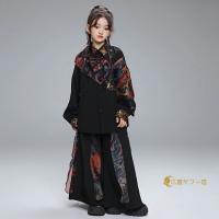 黒系 和風 キッズダンス衣装 セットアップ ヒップホップ 男の子 女の子 ブラック シャツ 長袖 スカーフアレンジ タイダイ フリルパンツ 赤黒 チャイナ風 Y2K 子