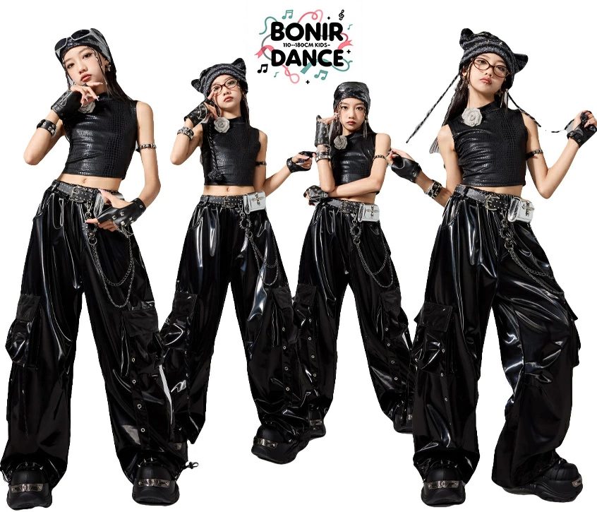 キッズ ダンス衣装 ガールズ ステージ ジャズ ヒップホップ 発表会 イベント おしゃれ 女の子 小中学生 衣装セット レザー コンテスト 韓国系 黒コーデ ダンサ