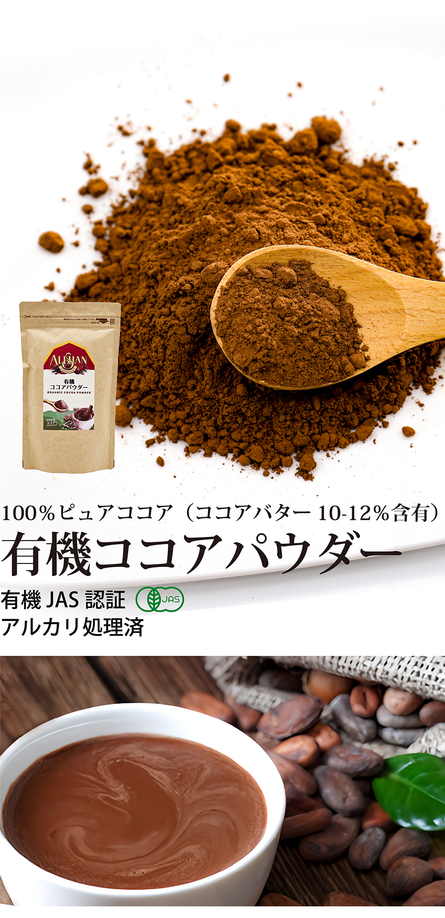 本製品のココアは、低温焙煎とダッチプロセスでまろやかな風味に仕上げた、オーガニックのピュアココアパウダーです。