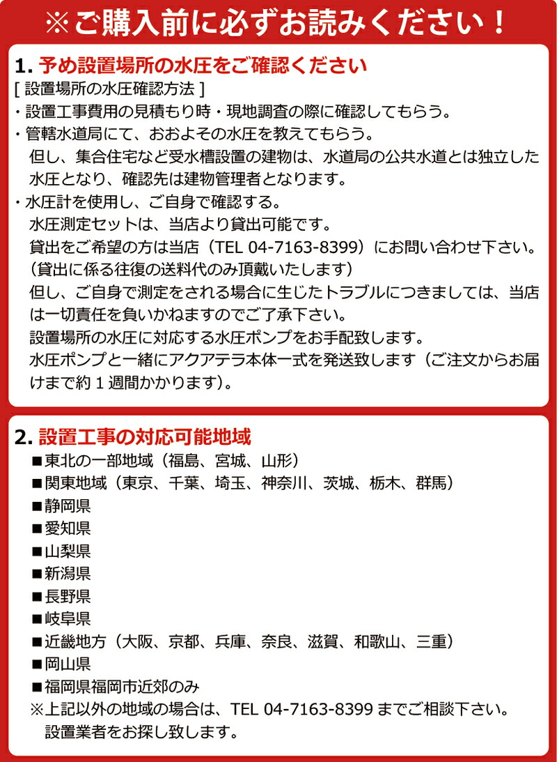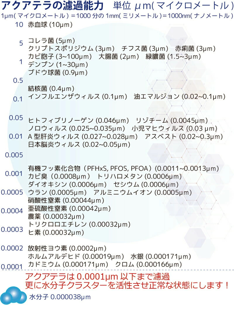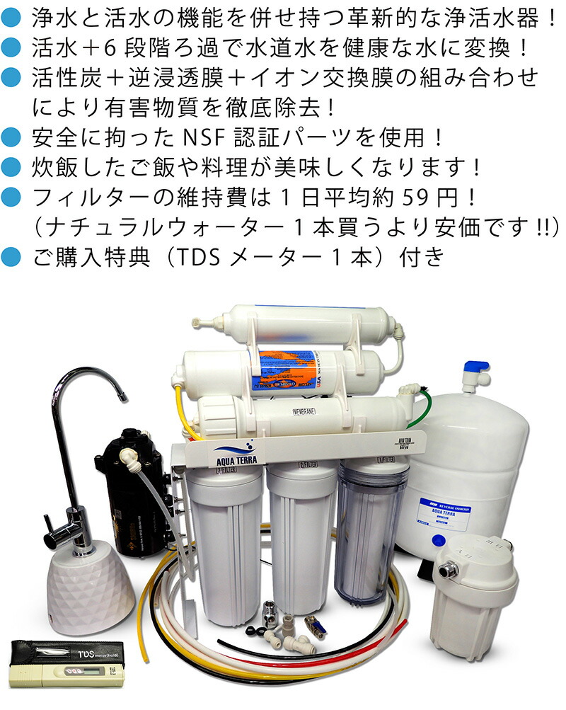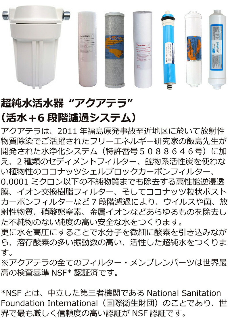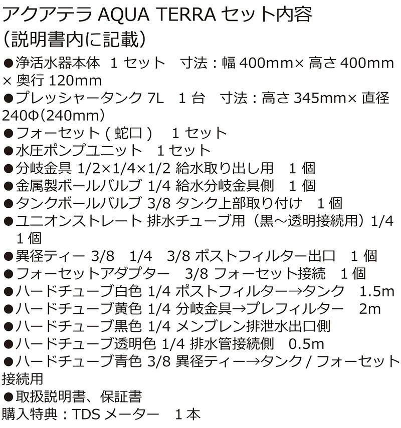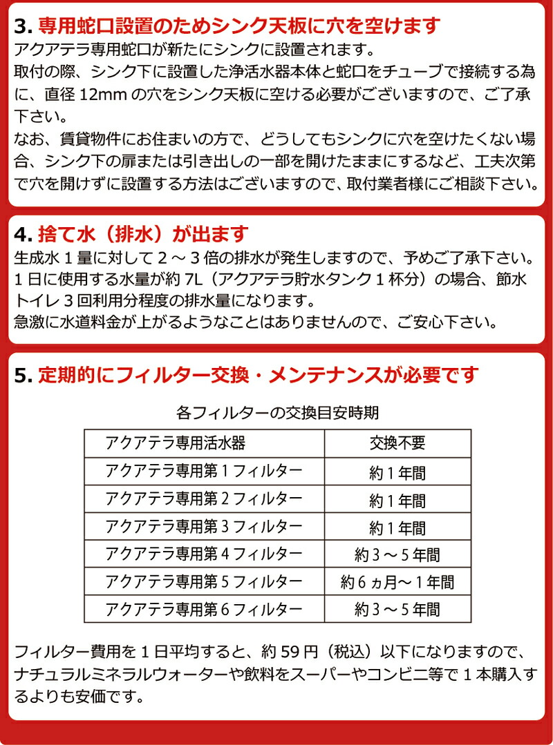 アクアテラは、これまでの一般家庭浄水器と比べてかなり高性能な仕上がりになっておりますので、目的や用途をよく検討した上でご購入下さい。