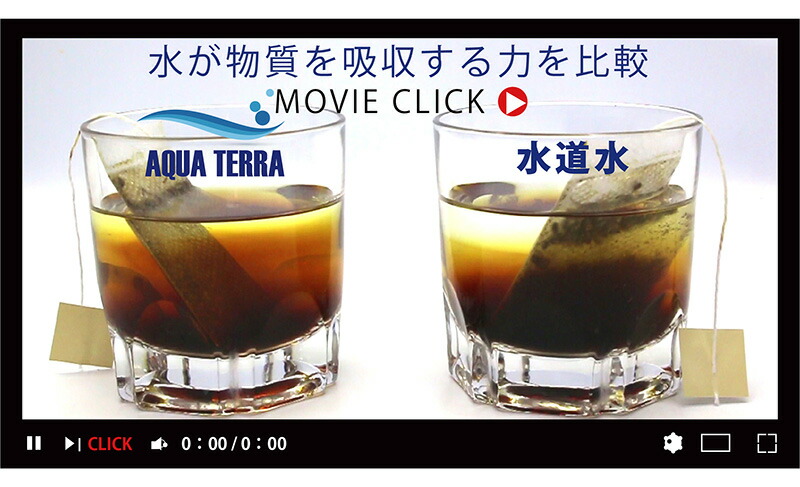 上記動画はアクアテラと水道水に紅茶を入れて、攪拌することなく、そのまま45分間(10000倍速)放置して、水が物質を吸収する様子を比較実験したものです。