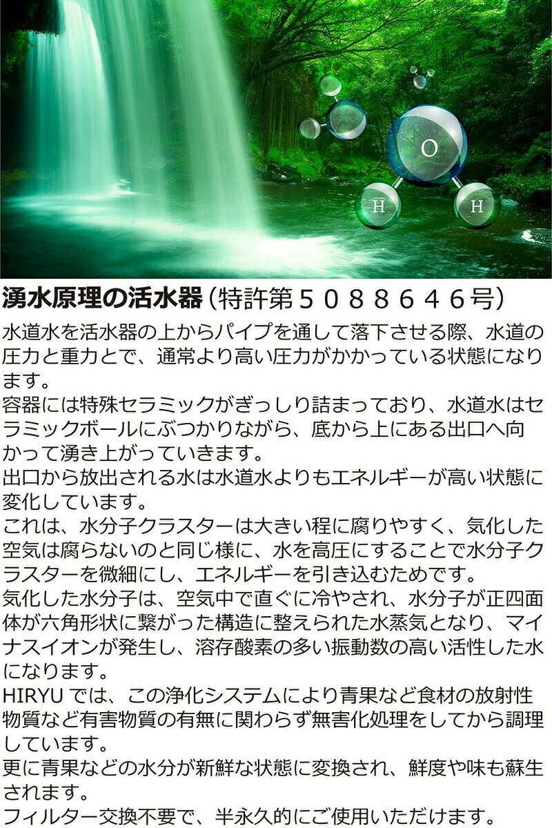 純度の高い、活水された水は、食物の成分を溶解する力が高いため、素材の味をひきだすので濃厚になり、更に活水させることで味もよくなります。