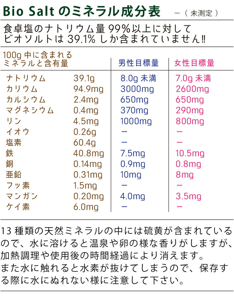 天然塩では唯一の「還元電位-350mv 抗酸化還元作用」(サビを取る)を持ち、もちろん天然100%(無添加・無着色・無香料)で、大自然のミネラル成分を豊富に含んでおり、まさに理想の「塩」=「ミネラル」です。