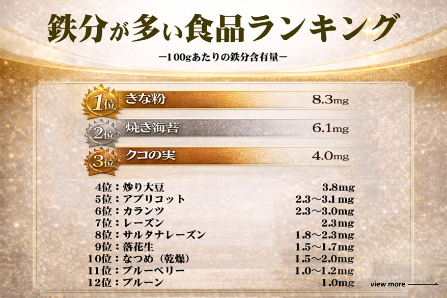 きな粉は100gあたりの鉄分含有量鉄分が多く、食品の中で鉄分ランキング1位です。