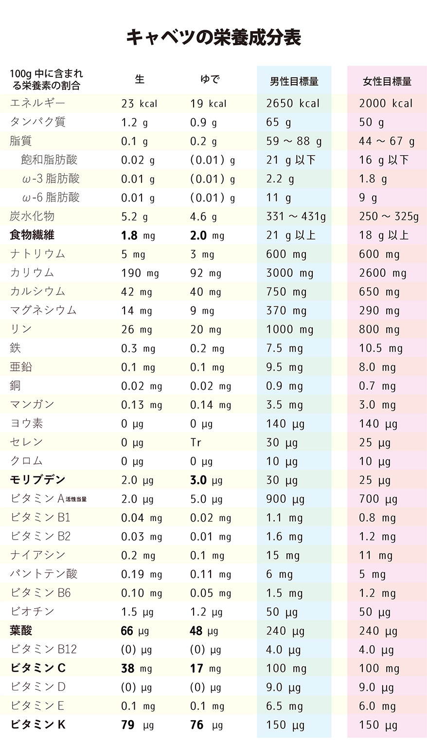 キャベツには、ビタミンCや、健康維持に役立つとされるビタミンU(別名キャベジン)が豊富に含まれています。