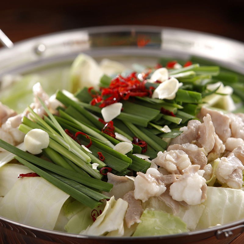 博多の美味を代表するひとつの『もつ鍋』。牛もつはもちろん国内産を使用。キャベツ、ニラなどたっぷり入れて食べたあと、うれしい『しめ』のちゃんぽん麺付き。
